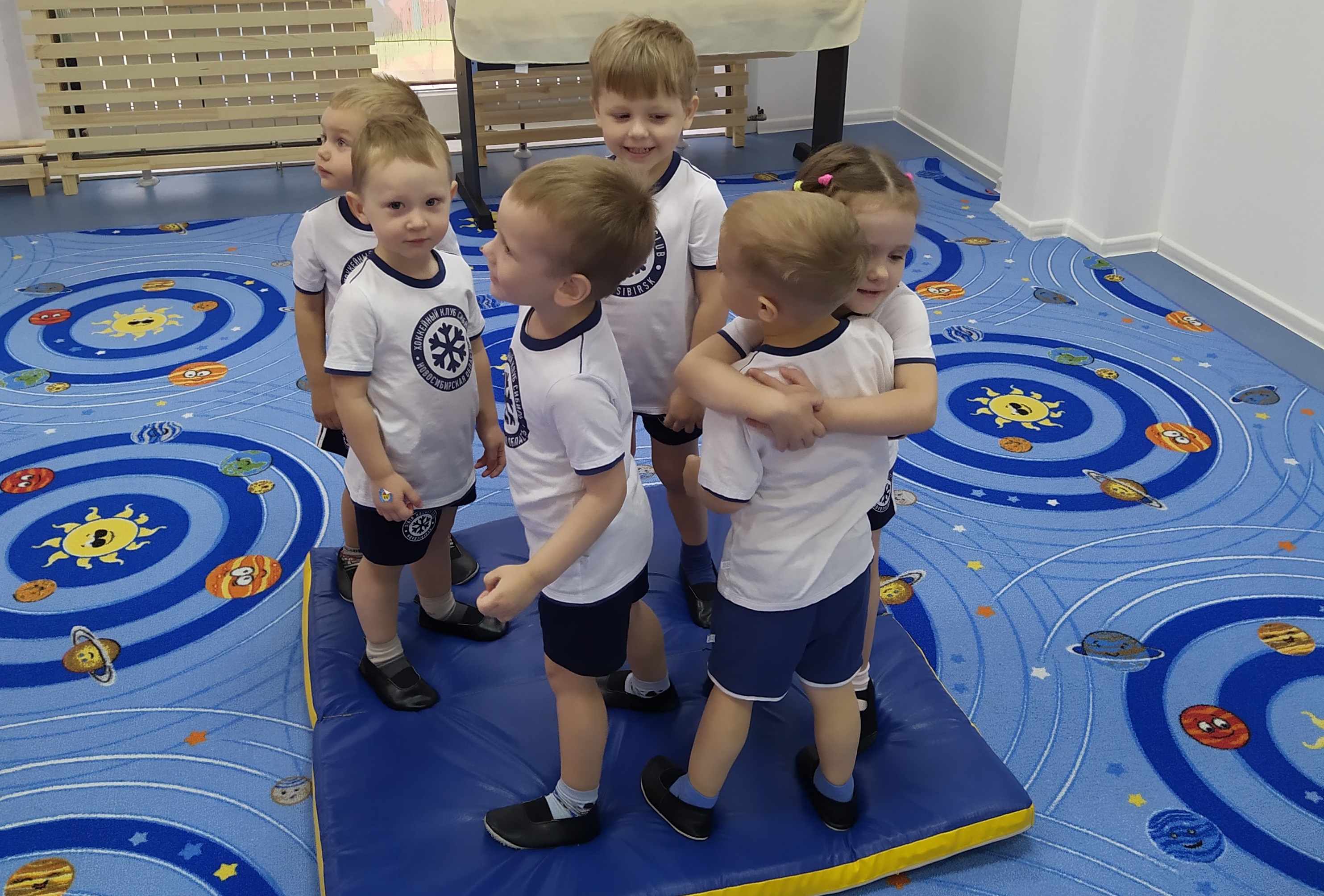 Тренер к нам приходит 3 раза в неделю. Занятия проходят весело, интересно. Как настоящая команда все занимаются в одинаковой форме (форму ребёнок получает в подарок при подписании договора).
